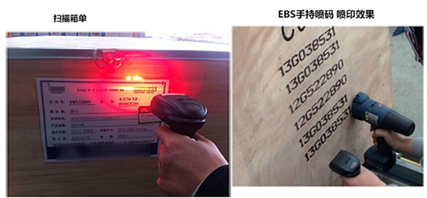 EBS手持噴碼機(jī)配掃描槍電梯包裝標(biāo)識解決方案,通過掃描箱單上條行碼,讀取電梯箱號(合同號),將電梯箱號清晰顯眼實(shí)時噴印在箱體上,自動化工具讀取和噴印,噴印內(nèi)容清晰、美觀,準(zhǔn)備,無需手動輸入。