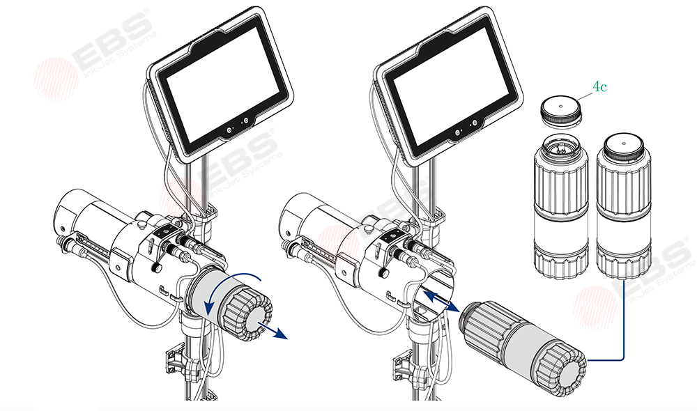 更換耗材時,機器甚至無需關機。如果噴碼機正在噴印,點擊機器或控制器上的圖標暫停噴印。然后擰下已經用空的墨水瓶,拿出。將新瓶的蓋子擰開,直接擰進噴碼機后部。控制器屏幕顯示新墨瓶信息后,點ok,新墨水瓶更換完成。