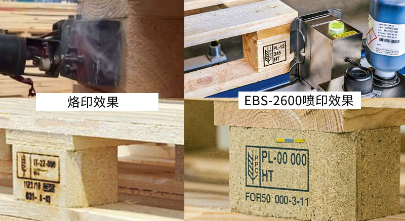 德國EBS-2600自動噴碼機在木托盤上噴印,數字噴墨打印替代燙印工藝,主要有以下優勢: