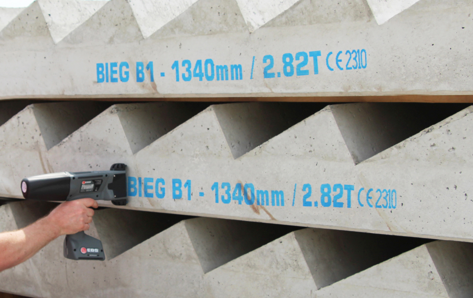對(duì)于混凝土制品,EBS手持噴碼機(jī)具有戶(hù)外專(zhuān)用墨水,在自然環(huán)境下面臨日曬、雨淋,字跡依舊整潔規(guī)范,不會(huì)出現(xiàn)掉色、移位等情況,杜絕二次返工,減少了人力、物力,提升了在預(yù)制樓板上打碼效率。